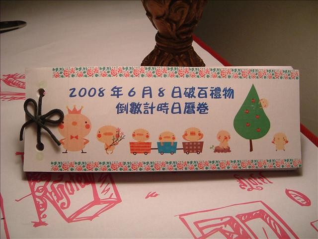 <!-- Origin Article URL: http://www.wretch.cc/blog/thumb7/11803484 --> <img style="WIDTH:461px;HEIGHT:310px;" height="476" alt="" src="http://pic.pimg.tw/yault/1341201428-3422371995.jpg" width="461"/><br/> <br/> 破百禮物實體<br/> 封面打了三個洞,聽說這樣的綁法會很牢固<br/> <br/> <img style="WIDTH:465px;HEIGHT:283px;" height="251" alt="" src="http://pic.pimg.tw/yault/1341201431-4292640905.jpg" width="451"/><br/> <br/> 一張A4紙有4天,<br/> 所以100天會有25張,<br/> 花了一個多小時將紙裁成近似一樣的大小!<br/> <br/> 每頁的虛線都有先割過,<br/> 每月的顏色都不一樣,<br/> 每天的文字都是我想說的話,<br/> 原本每天的底圖想做不一樣的,<br/> 但火燒屁股已不容許我這樣做。<br/> <br/> <img style="WIDTH:466px;HEIGHT:296px;" height="342" alt="" src="http://pic.pimg.tw/yault/1341201434-1076107363.jpg?v=1341201437" width="553"/><br/> <br/> 破百禮物大成功,<br/> 完成腦海中想像的作品,<br/> 讚!<br/> <br/> <img style="WIDTH:471px;HEIGHT:309px;" height="481" alt="" src="http://pic.pimg.tw/yault/1341201440-5566776.jpg" width="471"/><br/> <br/> 看到黃中滿足的笑容<br/> 一切辛苦都值得!<br/> <br/> 退伍禮物可以開工了,<br/> 這個禮物完成後,<br/> 我要去站崗的女人版po感言!<br/> 哇哈哈<br/>