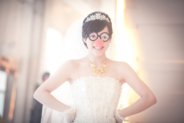 新娘服搭配造型眼鏡與紅鼻子